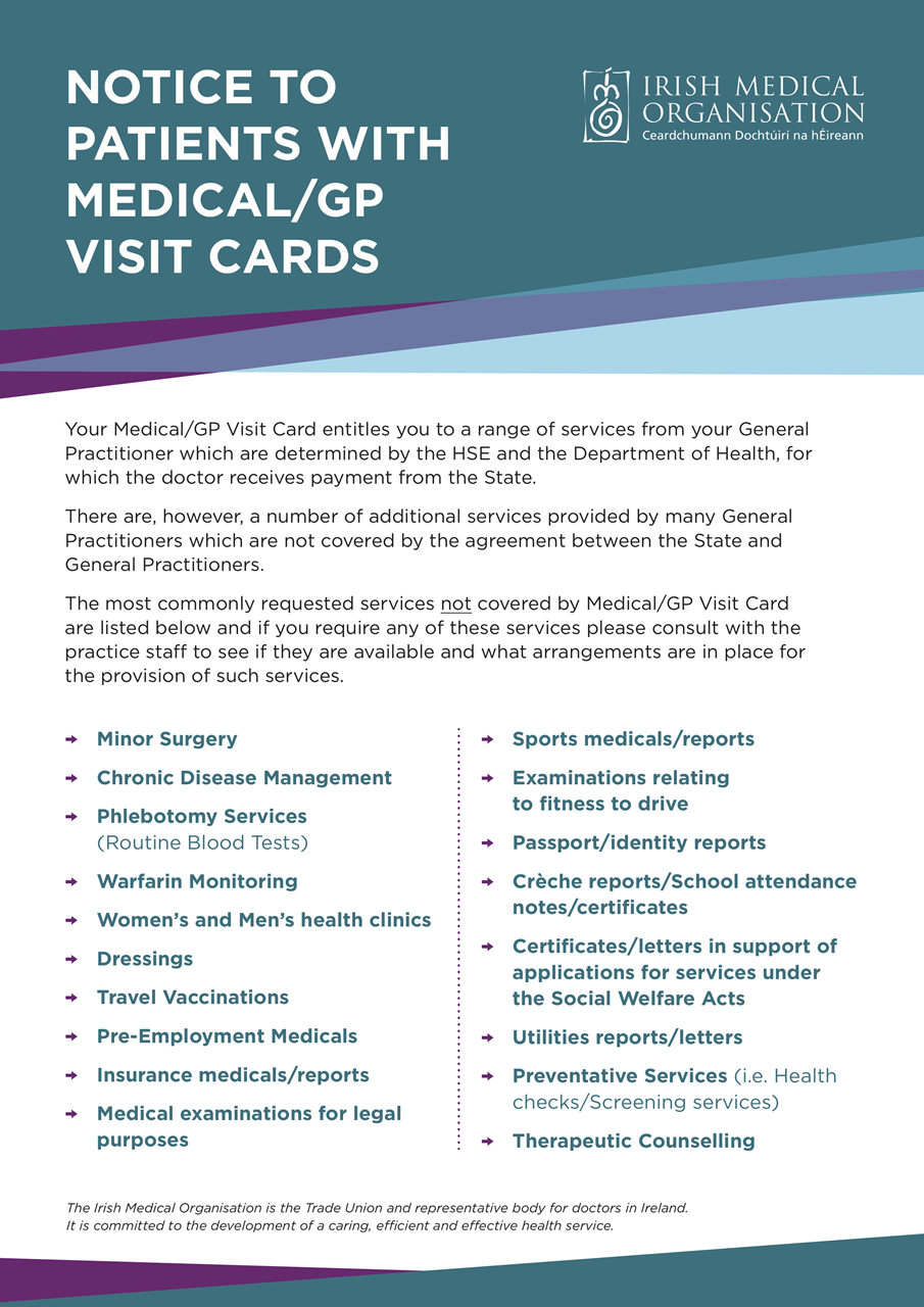There is a fee of €10.00 for blood tests for all medical card/GP visit card holders to be paid prior to consultation.